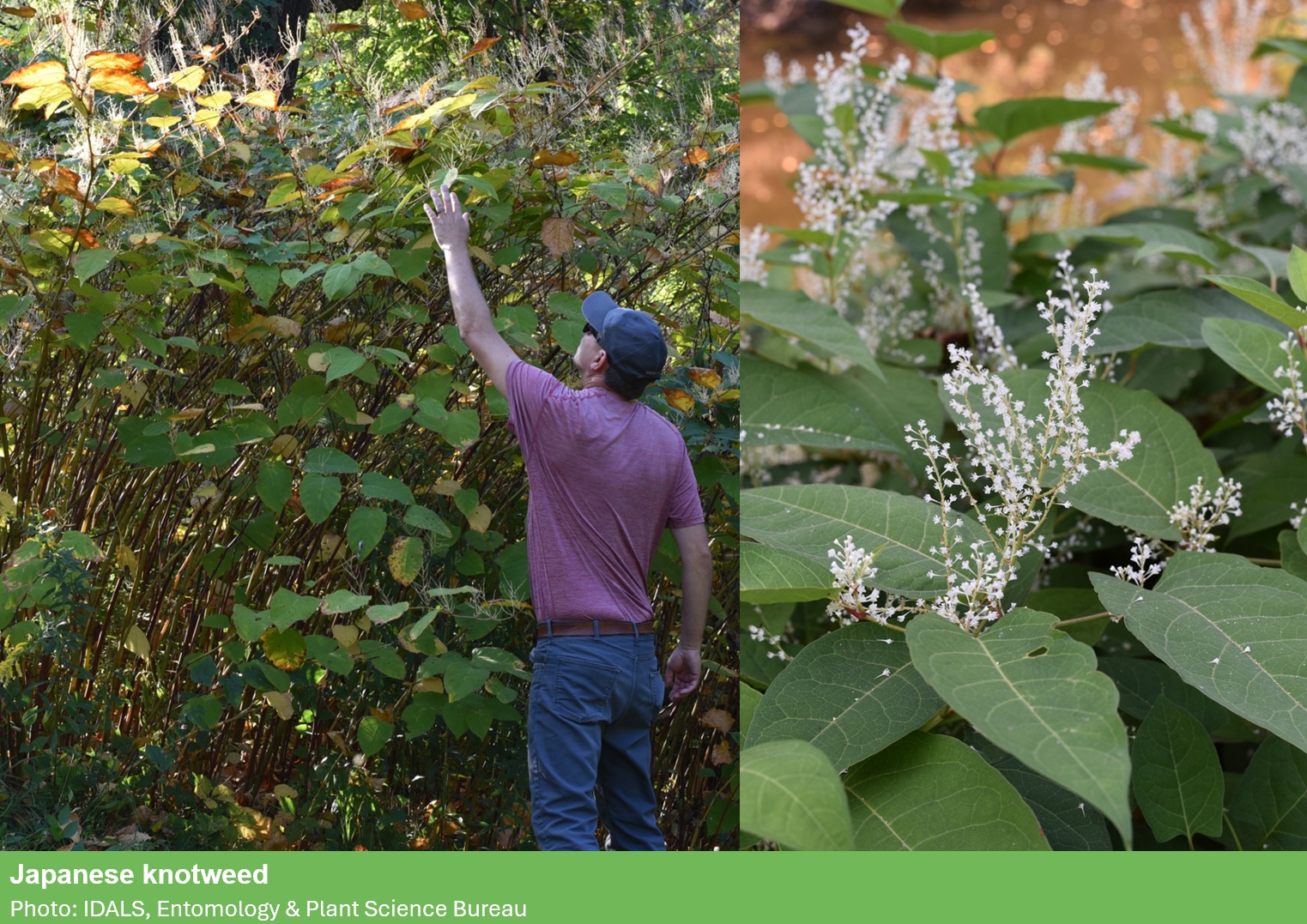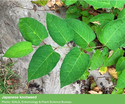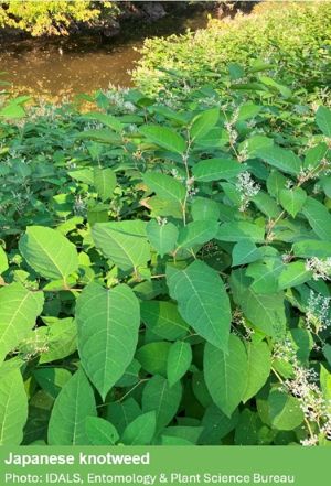 Japanese Knotweed (Fallopia japonica) is native to eastern Asia and was introduced to the U.S. in the late 1800’s. It was brought to the U.S. as a garden ornamental and as a means for erosion control but has become problematic as an invasive species with its ability to grow vigorously in a wide range of conditions. This invader favors roadsides, streambanks, and ditches in parts of the state. Other common names include Mexican bamboo and fleeceflower.